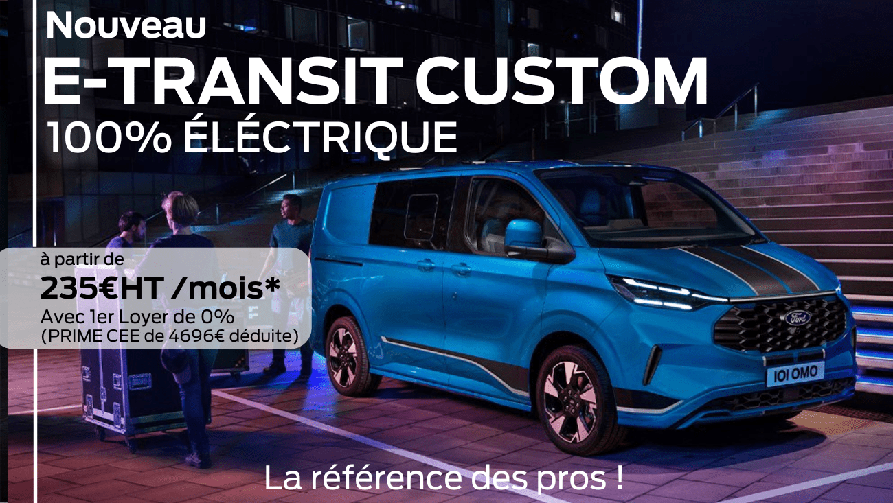*Location longue durée 25 mois / 30 000 km avec maintenance / assistance d’un FORD E-TRANSIT CUSTOM 320 L1H1 ELECT 160 KW – 64 KWH LIMITED FOURGON TOLE Boite Automatique disponible sur stock au tarif du actuel, soit 25 loyers de 235€HT. Avec un premier loyer ramené a 0€ après déducation de la PRIME CEE SIPLEC de 4696€.