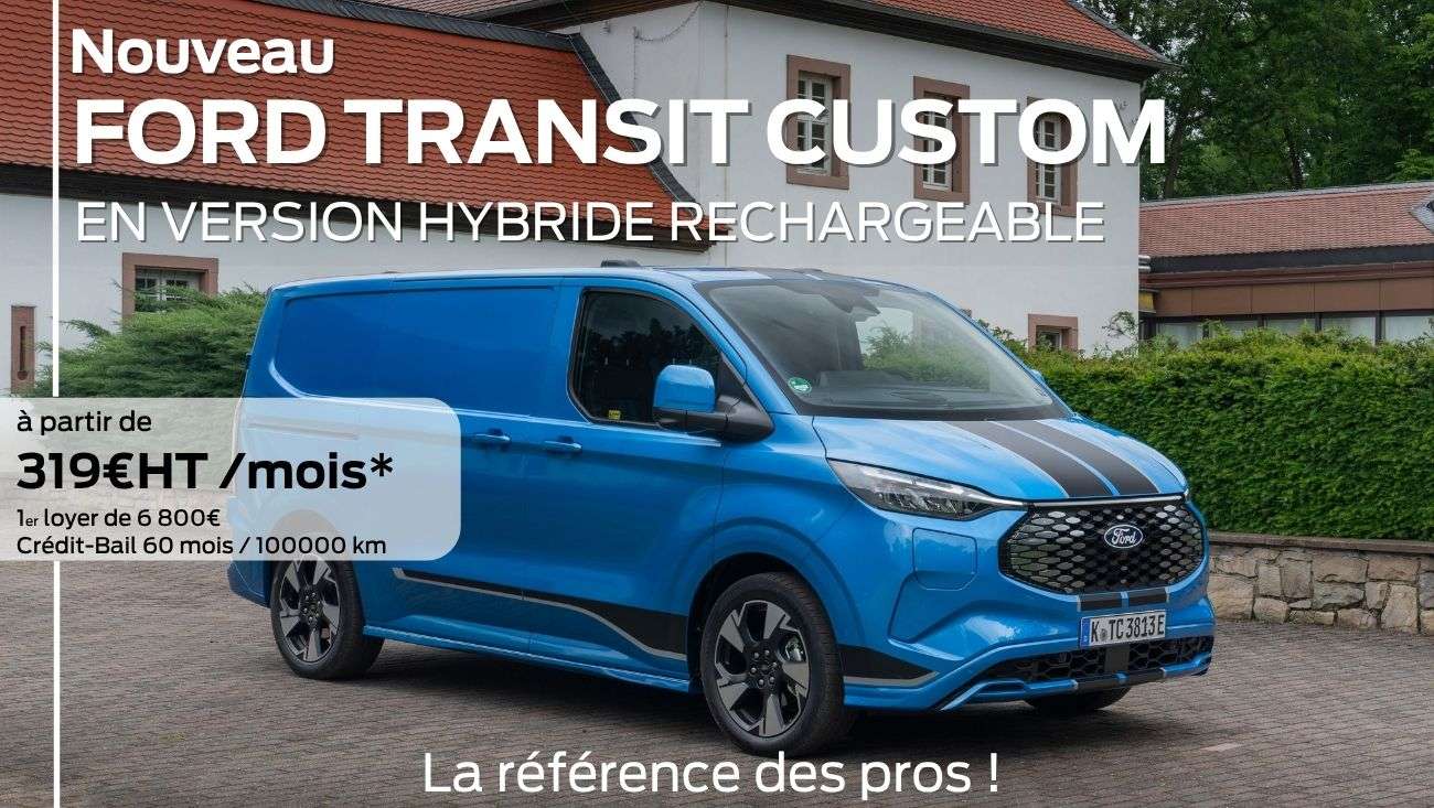 *Offre de crédit-bail ballon d’un Transit Custom PHEV 320 L1H1 Trend 2.5 Duratec 232ch hybride rechargeable, au tarif du 23/07/2025. Offre sur 60 mois et 100000 km, perte financière incluse. Carte grise non incluse. Montant de l’option d’achat en cas de levée de l’option : 14091€ HT avec un 1er loyer de 6800€ HT puis 59 loyers de 319€ HT, coût total si achat : 39712€ HT.