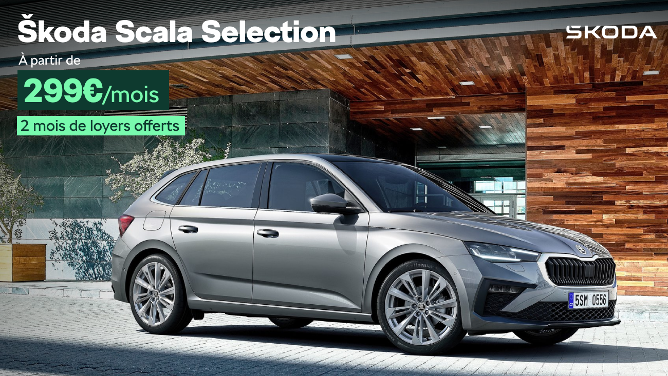 Škoda Scala à partir de 299€/mois ⁽¹⁾, sans apport. 3 ans de garantie⁽²⁾, d’entretien⁽³⁾ et d’assistance inclus. ⁽¹⁾ Location longue durée sur 37 mois, 2 mois de loyers offerts après 1er loyer de 299€ suivi de 34 loyers de 299€, immatriculation au plus tard le 31/12/2024. Remise Škoda de 5 400€ déduite du prix catalogue. Offre valable du 5 novembre 2024 au 31 décembre 2024.Exemple pour une Škoda Scala Selection 1.0 TSI 95ch BVM en location longue durée de 37 mois et pour 30 000 km maximum, 2 mois de loyers offerts après 1er loyer de 299€ suivi de 34 loyers de 299€, immatriculation au plus tard le 31/12/2024, hors assurances facultatives. Offres réservées aux particuliers chez tous les distributeurs présentant ce financement, aides à la remise déduites du tarif au 05/11/2024. Sous réserve d’acceptation du dossier par VOLKSWAGEN BANK GMBH – SARL de droit allemand – Capital social : € 318 279 200 – Siège social : Braunschweig (Allemagne) – RC/HRB Braunschweig : 1819 – Intermédiaire d’assurance européen : D-HNQM-UQ9MO-22 (www.orias.fr) – Succursale France : Bâtiment Ellipse, 15 avenue de la Demi-Lune – 95700 Roissy-en-France – RCS Pontoise : 451 618 904 – Administration et adresse postale : 11, avenue de Boursonne – B.P. 61 – 02601 Villers-Cotterêts Cedex. Depuis le 1er septembre 2018, les véhicules légers neufs sont réceptionnés en Europe sur la base de la procédure d’essai harmonisée pour les véhicules légers (WLTP), procédure d’essai permettant de mesurer la consommation de carburant et les émissions de CO2, plus réaliste que la procédure NEDC précédemment utilisée. ⁽²⁾ Garantie 2 ans + 1 an de garantie additionnelle incluse limitée à 60 000 Km. ⁽³⁾ Contrat d’entretien VIP obligatoire souscrit auprès de Volkswagen Bank GmbH. ⁽⁴⁾ Pour immatriculation au plus tard le 31/12/2024. Les outils d’aide à la conduite ne dispensent pas le conducteur d’être vigilant.